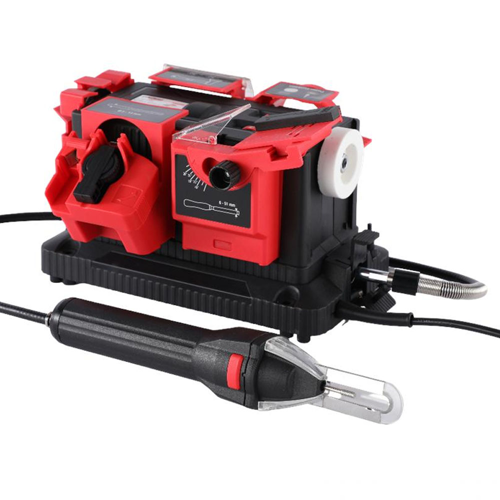 Si alguna vez has intentado afilar una broca de metal usando una esmeriladora de banco tradicional, sabrás lo difícil que es. Si fallas el ángulo por un solo grado o la afilas de forma asimétrica, la broca no cortará y, peor aún, vibrará destrozando el agujero. Este equipo elimina por completo el error humano gracias a sus carcasas plásticas de color rojo, las cuales actúan como plantillas guía de precisión.