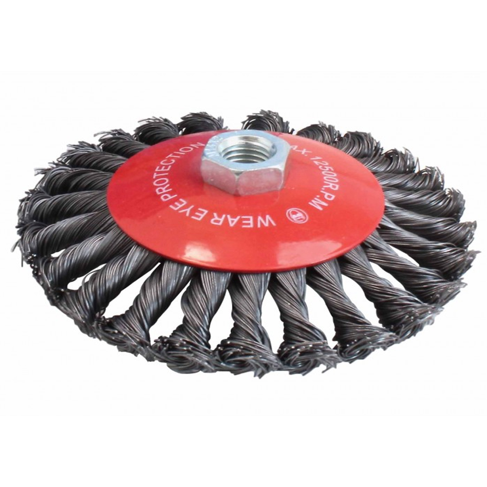 Este accesorio es un híbrido táctico. Su forma de «platillo volante» (cónica) le permite acceder a grietas y ángulos cerrados, mientras que su construcción de alambre trenzado le otorga la rigidez necesaria para arrancar las costras más duras de escoria, óxido laminado y pintura epoxi sin piedad.