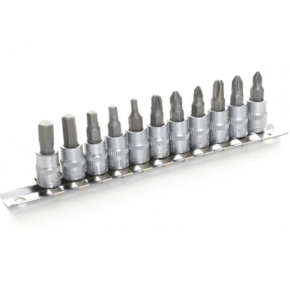 Un juego de puntas de vaso profesional debe cubrir los estándares de tornillería más comunes. El modelo KD10240 destaca por su selección estratégica de 11 puntas: