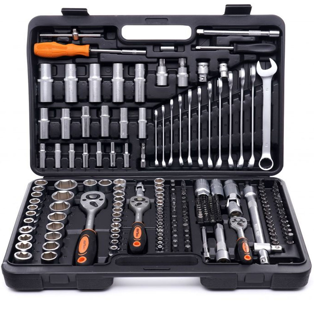 Un maletín de herramientas profesional completo debe ofrecer diferentes palancas de fuerza. Este kit incluye tres trinquetes de 72 dientes, lo que permite un ángulo de recuperación de solo 5 grados, ideal para trabajar en compartimentos de motor compactos. La carraca de 1/2″ está diseñada para tareas de alto torque como suspensiones o soportes de motor; la de 3/8″ es la medida intermedia perfecta para la mayoría de reparaciones mecánicas; y la de 1/4″ ofrece la sensibilidad necesaria para trabajos de electrónica y salpicaderos. Contar con esta variedad en su maletín de herramientas profesional asegura que siempre aplique la fuerza correcta sin riesgo de cizallar tornillos pequeños.