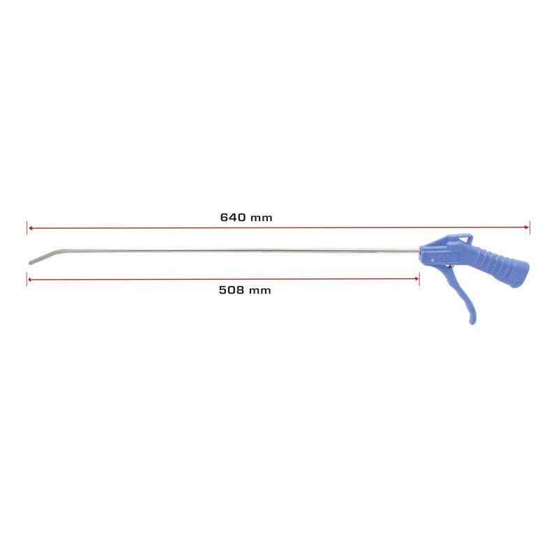 - Lanza de 508mm: El tubo metálico es rígido para no vibrar con la presión del aire, pero lo suficientemente fino para entrar entre los paneles de refrigeración de los radiadores industriales.
